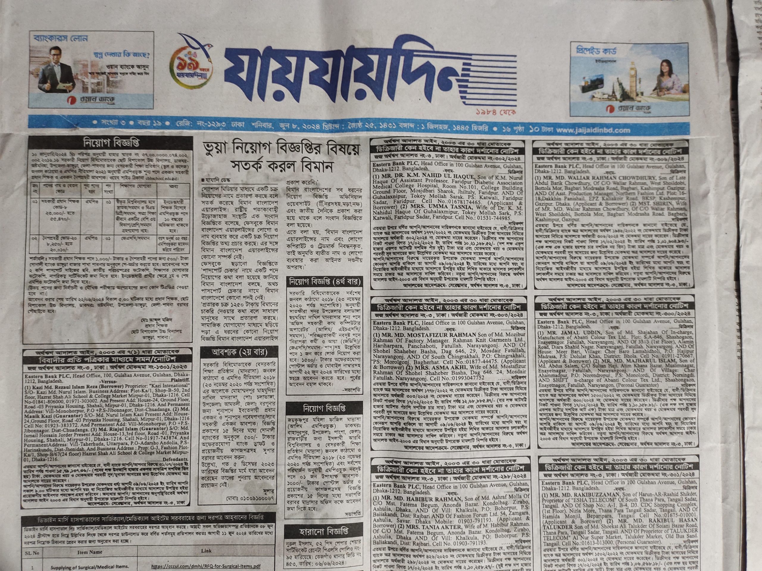 সহকারী প্রধান শিক্ষক ও নৈশ প্রহরী পদে নিয়োগ বিজ্ঞপ্তি, যায়যায়দিন পত্রিকা, ০৮ জুন ২০২৪ ইং। |